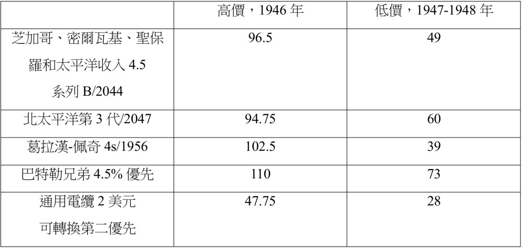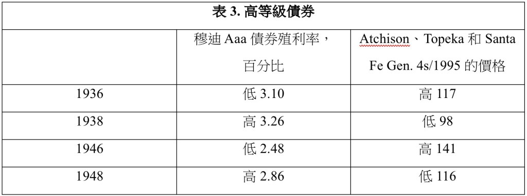 如表3所示,1946年至1948年間利率的溫和變化導致Atchison General 4s的本金價值下降了約20%。這個例子表明,以歷史高溢價購買高等級長期債券並不是一件好事。