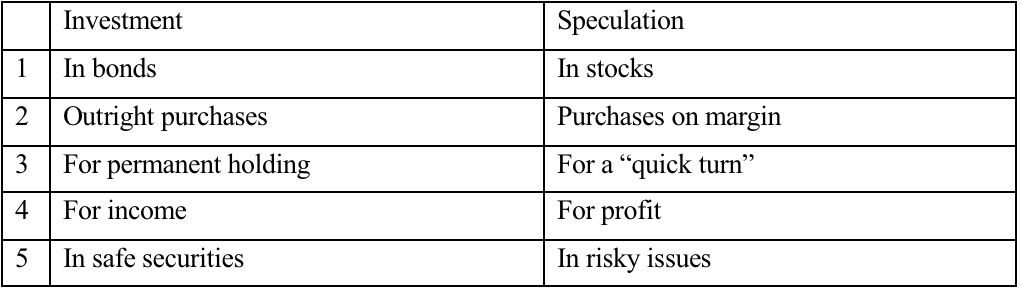 同樣,永久持有和臨時持有之間的對比僅適用於廣泛且不精確的方式。普通股權威機構將投資定義為任何旨在持有一年或更長時間的購買行為;但無可否認,這個定義是出於其便利性而不是其滲透性。短期投資是一種行之有效的做法,這顯示了這條建議規則的不精確性。長期投機同樣是一個令人遺憾的事實(當購買者持有希望彌補損失時),並且在某種程度上也是一種有意的從事。