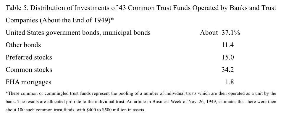 信託基金的投資須遵守類似的規定,除非信託工具的製定者不受此類限制。 (這方面的法律正在自由化,紐約州1950年通過的法規就證明了這一點,該法規允許受限制的資金投資於普通股,比例不得超過總額的35%。)