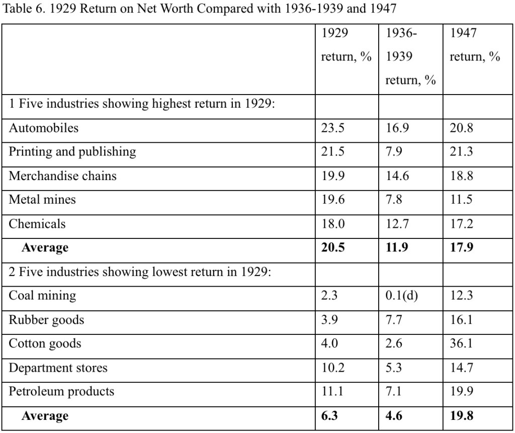 當產業分析得出與流行的結論不同的有根據的結論時,它是最有用的。通常,這樣的結論將預測長期持續的狀況或趨勢的逆轉,從而被華爾街視為永久性的。這種逆轉的情況出乎意料地頻繁。特別是,第二次世界大戰及其後果使工業集團的相對盈利能力發生了巨大變化。表 6 對此進行了說明,該表顯示了紐約國家城市銀行編制的 1929 年、1936-1939 年和 1947 年的資本利得。