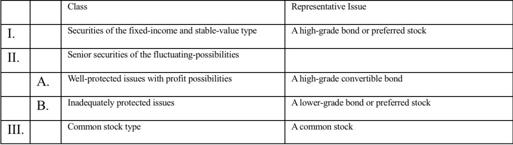 三種類型的主導特徵 | 第一類包括任何名稱的債券,這些債券是在合理預期收益將繼續保持不變且其市場報價不會與購買價格相差很大的情況下購買的。業主的主要利益在於本金的安全,其做出承諾的唯一目的是獲得穩定的收入。在第二類中,本金價值的預期變化具有實際意義。在A類中,投資人希望獲得直接投資的安全性,並透過轉換權或某些類似特權增加獲利的可能性。在 B 類中,確認了明確的損失風險,該風險可能被相應的獲利機會所抵銷。 IIB 類證券與普通股類型(III 類)證券在兩個方面有所不同:(1)相對於一些初級發行,它們享有有效的優先權,從而給予它們一定程度的保護; (2) 與理論上或從樂觀或幸運的方式與普通股相關連的無限百分比的可能收益相比,無論多麼巨大,它們的利潤可能性都有一個相當明確的限制。