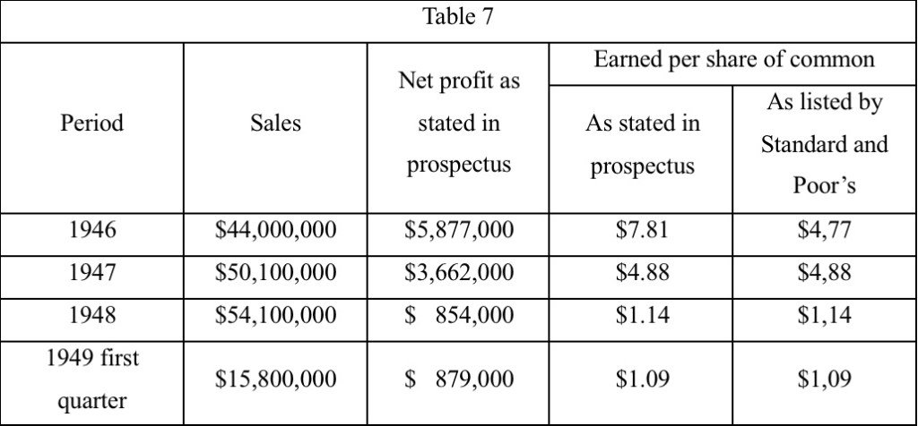 在這個重要的案例中,相關所得稅(related income tax)直接適用於利潤,而不是像(a)和(b)項那樣透過腳註提及矣已。這一條目說明了與非經常性項目相關的會計或報告問題——這一點顯然就是如此。在 1946 年向股東提交的報告中,這項特殊利潤被排除在收入帳戶之外,並直接記入盈餘。 (因此,標準普爾收益摘要中沒有提及它。)在製定招股說明書時,顯然決定將其納入損益表(profit and loss),因為它實際上是 1946 年實現的利潤。因此,該專案留給了證券分析師。