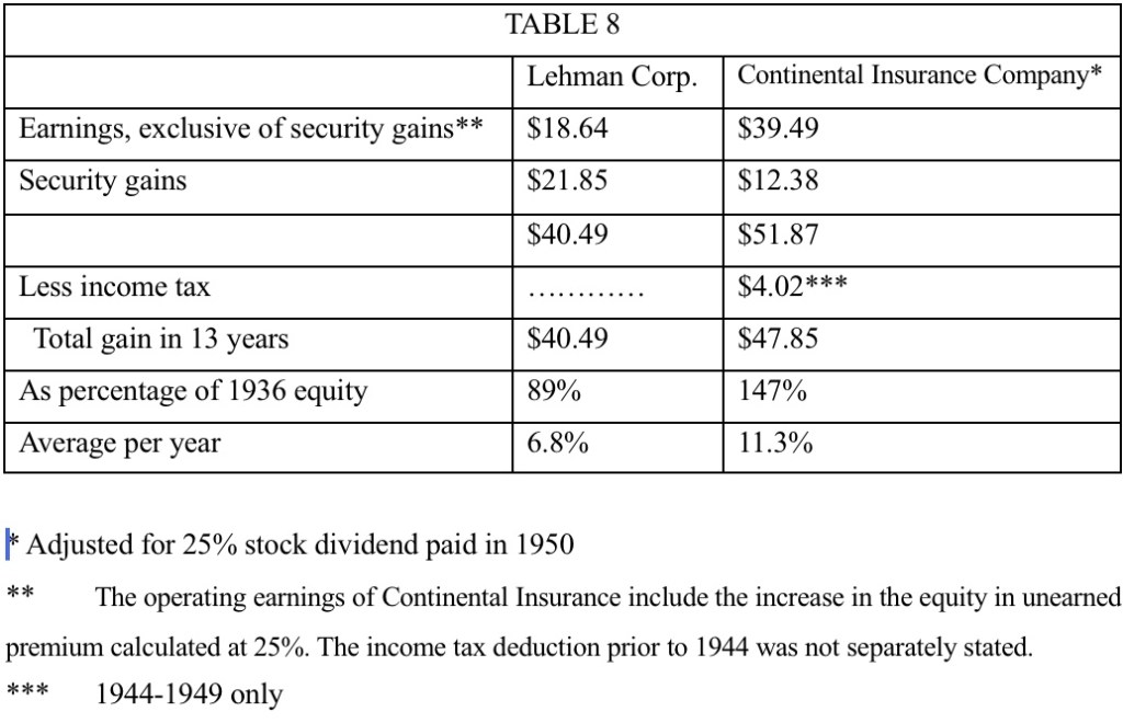 表 8 列出了 1937 年至 1949 年 13 個日曆年中投資基金和保險公司的每股總體業績,按營業收入和投資組合收益劃分。