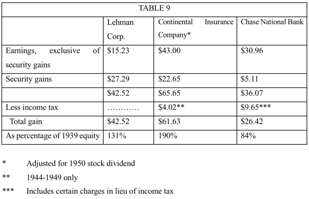 表 9 提供了 1940-1949 年 10 個日曆年的相應資料和大通國家銀行資料。 (1940 年之前銀行無法獲得證券利潤的單獨數據。)這些數據將顯示投資組合業務在三類金融公司中的相對重要性。